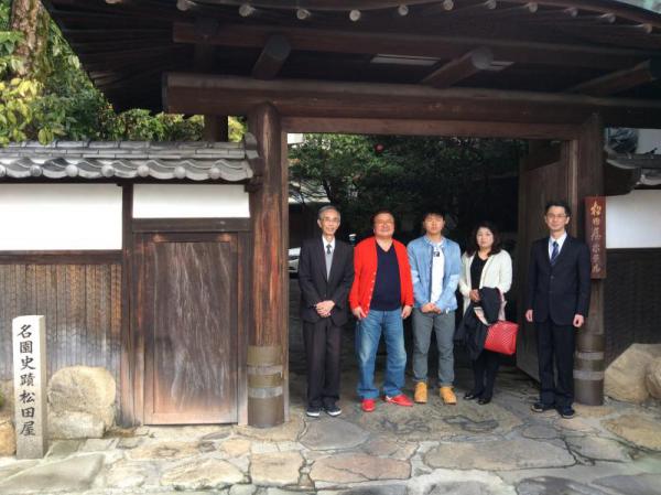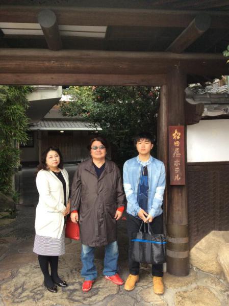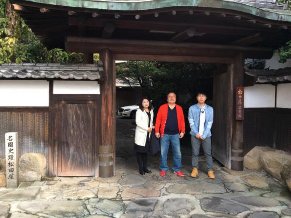 松田屋の社長、専務と正門玄関で記念撮影