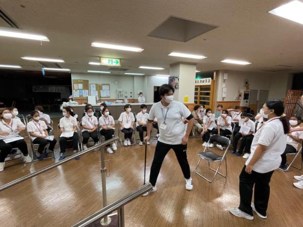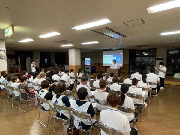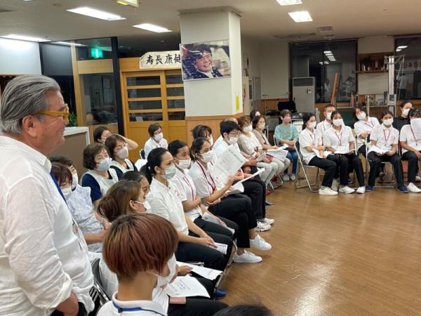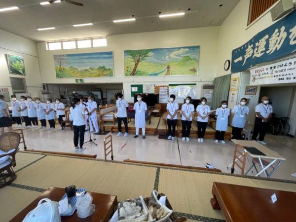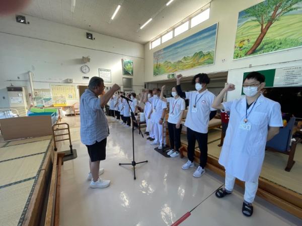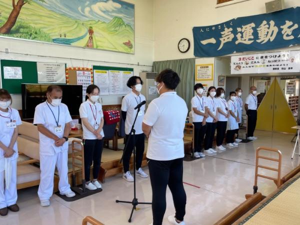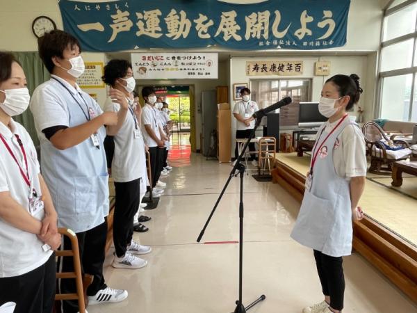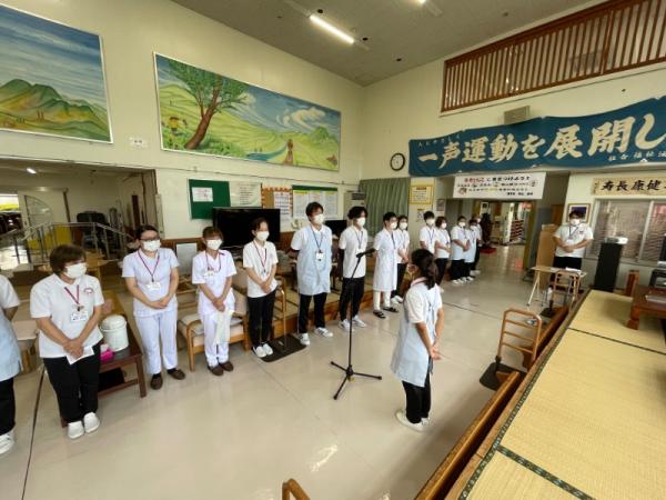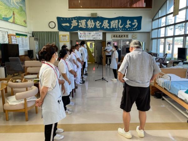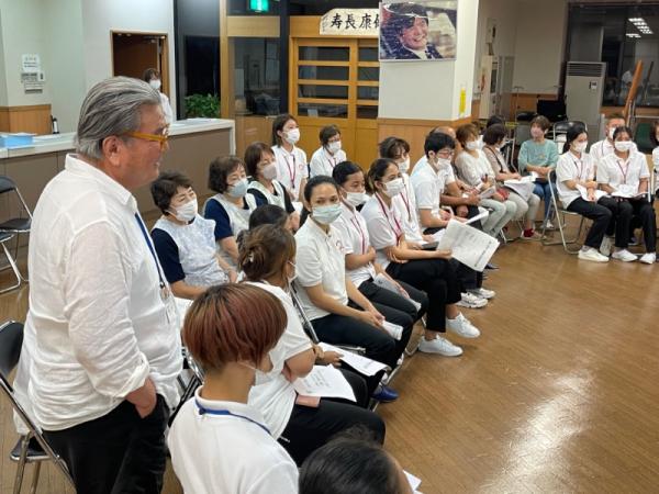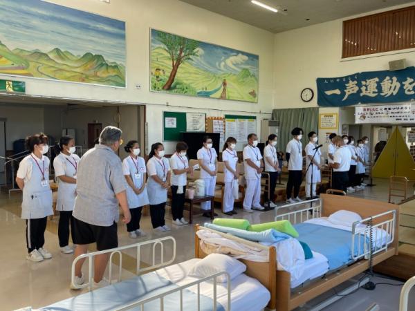 1週間に1回、ことぶき園、デイサービス、訪問介護、日の出荘、ふれ愛ビレッジ、日の出クリニック、123調剤薬局と連携を図る為に合同朝礼を行います。