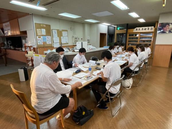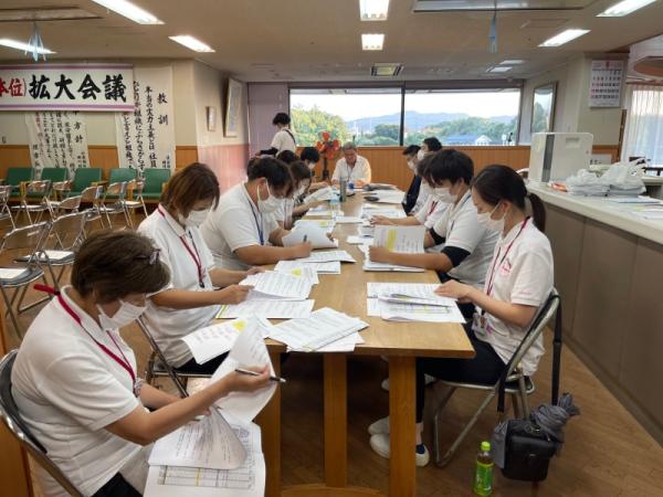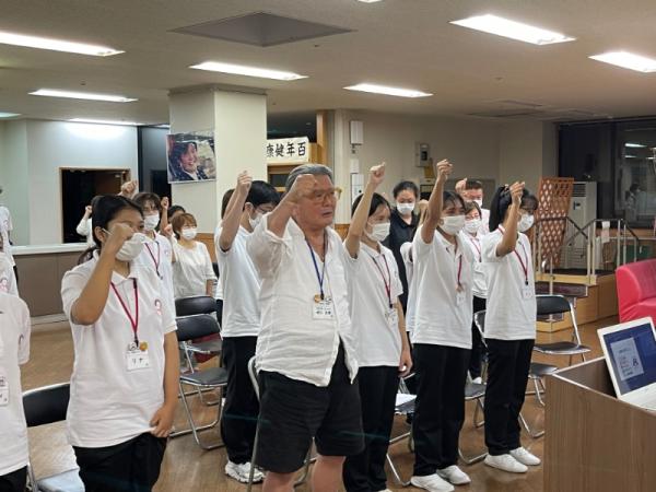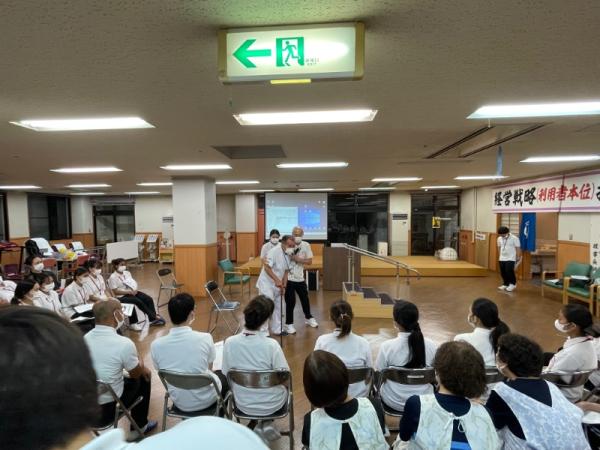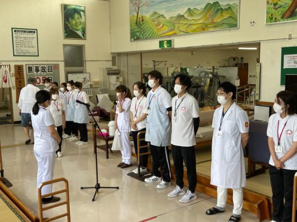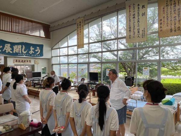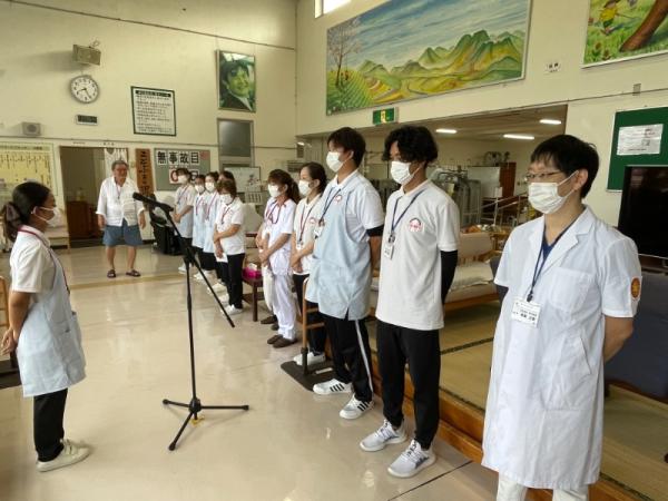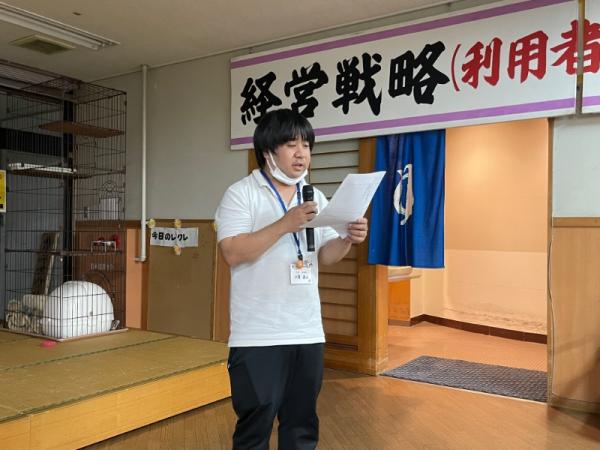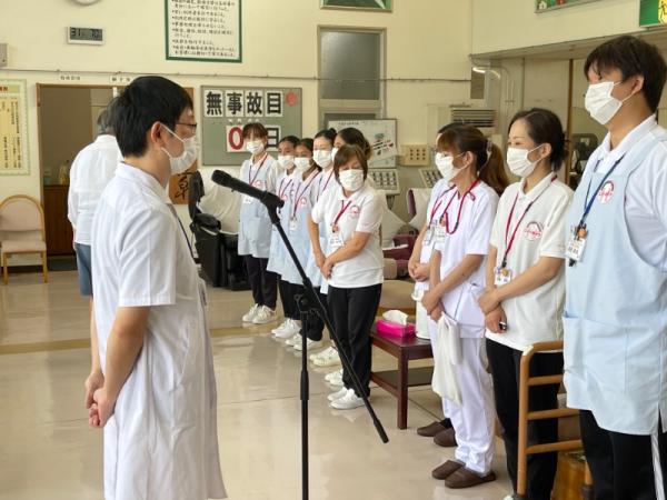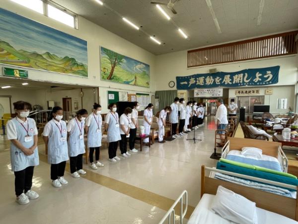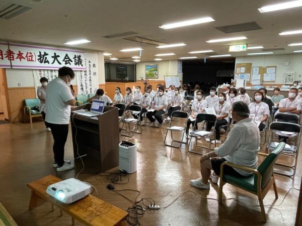 1週間に1回、ことぶき園、デイサービス、訪問介護、日の出荘、ふれ愛ビレッジ、日の出クリニック、123調剤薬局と連携を図る為に合同朝礼を行います。